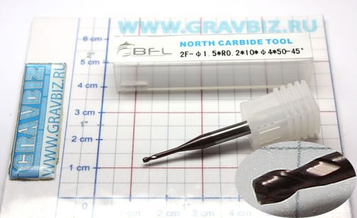 Фреза концевая торец DØ1,5мм, хвостовик L50мм Ød4мм 2 зуба, радиусная 0,2мм, длинная шейка 10, 2DFCR-0401510050-R02