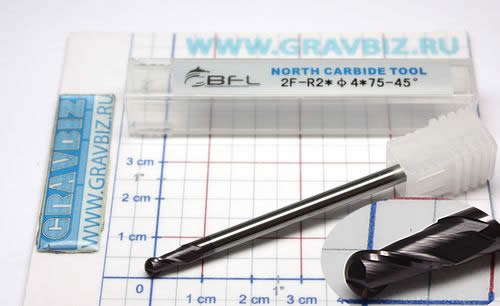 Фреза концевая, 2х заходная, сферическая R1,5мм, торец DØ3мм, длинная L75 мм, хвостовик Ød4мм; покрытие AlTiN, твердость HRC45, 2LSBN-04030075